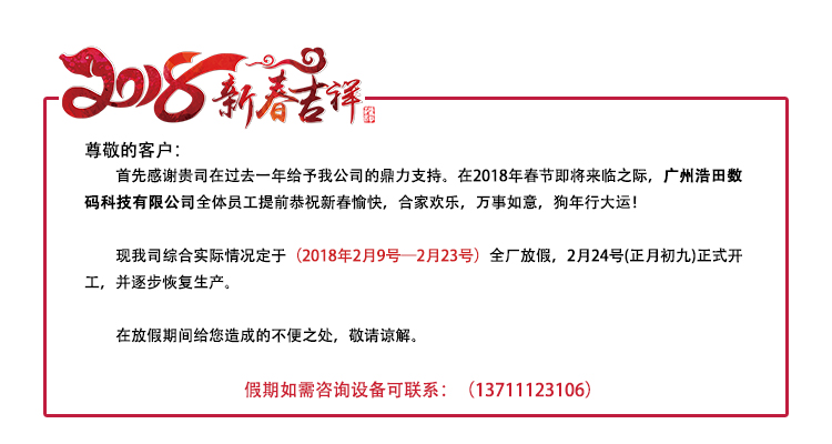 首先感謝貴司在過去一年給予我公司的鼎力支持。在2018年春節即將來臨之際,廣州浩田數碼科技有限公司全體員工提前恭祝新春愉快,合家歡樂,萬事如意,狗年行大運!      現我司綜合實際情況定于2018年2月9號(十二月二十三)至2月23號(正月初八)全廠放假,2月24號(正月初九)正式開工,并逐步恢復生產。