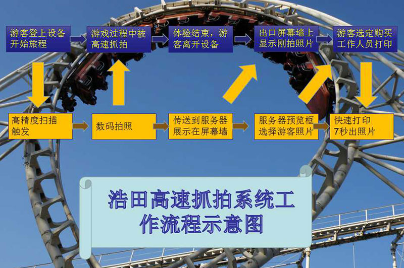 自動(dòng)檢測 → 觸發(fā)并拍攝 → 自動(dòng)傳輸→ 終端自動(dòng)讀取照片信息→屏幕顯示→游客下車后瀏覽照片 → 游客做出選擇 → 自動(dòng)打印 → 領(lǐng)取包裝照片