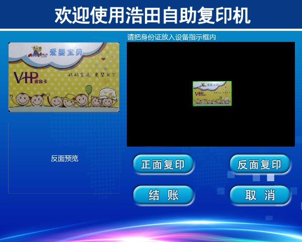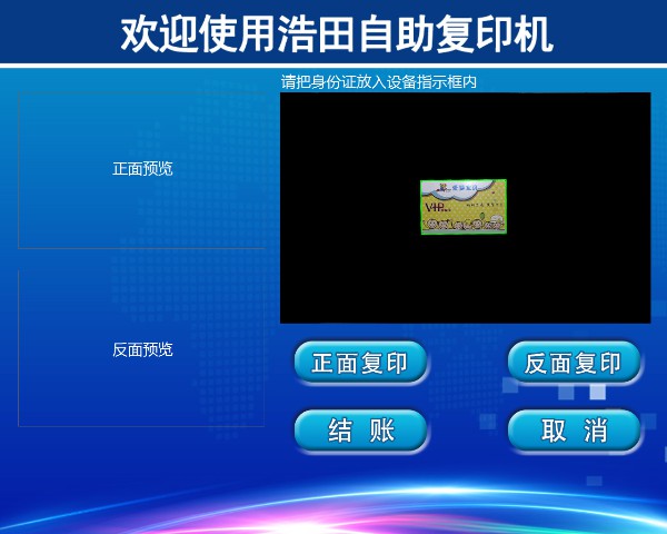 把身份證反面放入掃描框,點(diǎn)擊【反面復(fù)印】,左側(cè)顯示完成后可點(diǎn)擊【結(jié)賬】