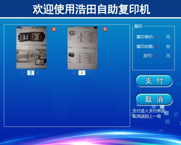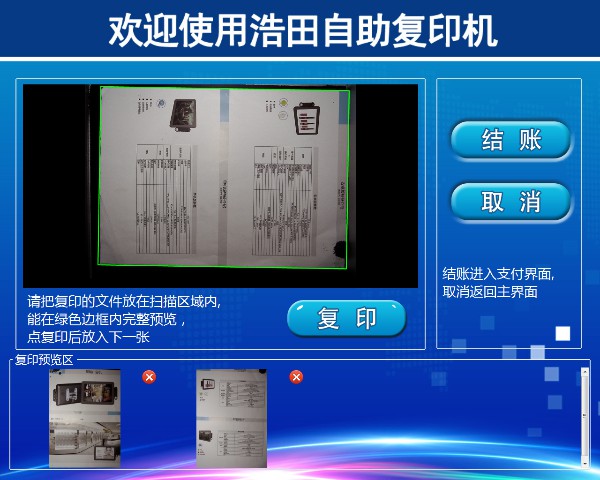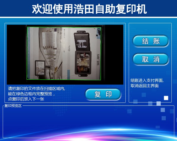 把文檔/圖片放入掃描框內(nèi),自動(dòng)識(shí)別掃描進(jìn)系統(tǒng),在預(yù)覽區(qū)顯示,點(diǎn)擊【結(jié)賬】后后按照您復(fù)印的內(nèi)容加減份數(shù),最后點(diǎn)【支付】