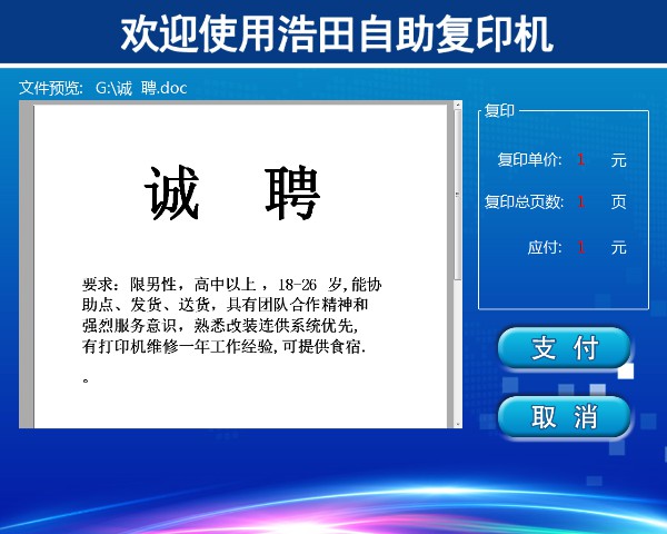 在界面上找出要打印的文件,點(diǎn)擊然后按【確認(rèn)】,在預(yù)覽區(qū)預(yù)覽無(wú)誤后點(diǎn)擊【支付】。